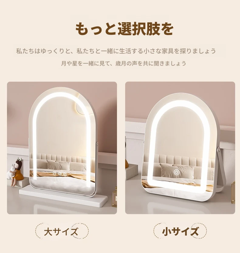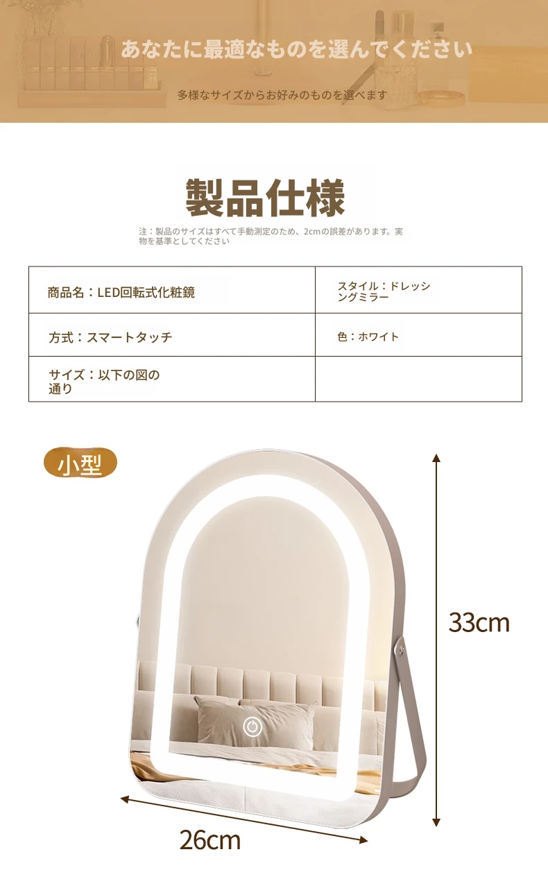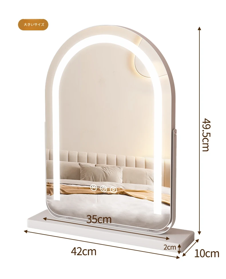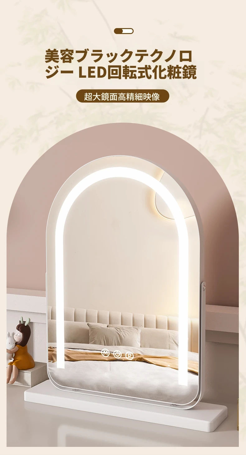 LEDライト付き回転式化粧鏡 - 大型アーチ型デスク用ミラー、スマート機能搭載!自宅の寝室やドレッサーに最適!明るさ調整可能で、あなたの美しさを引き立てる完璧なアイテムです!